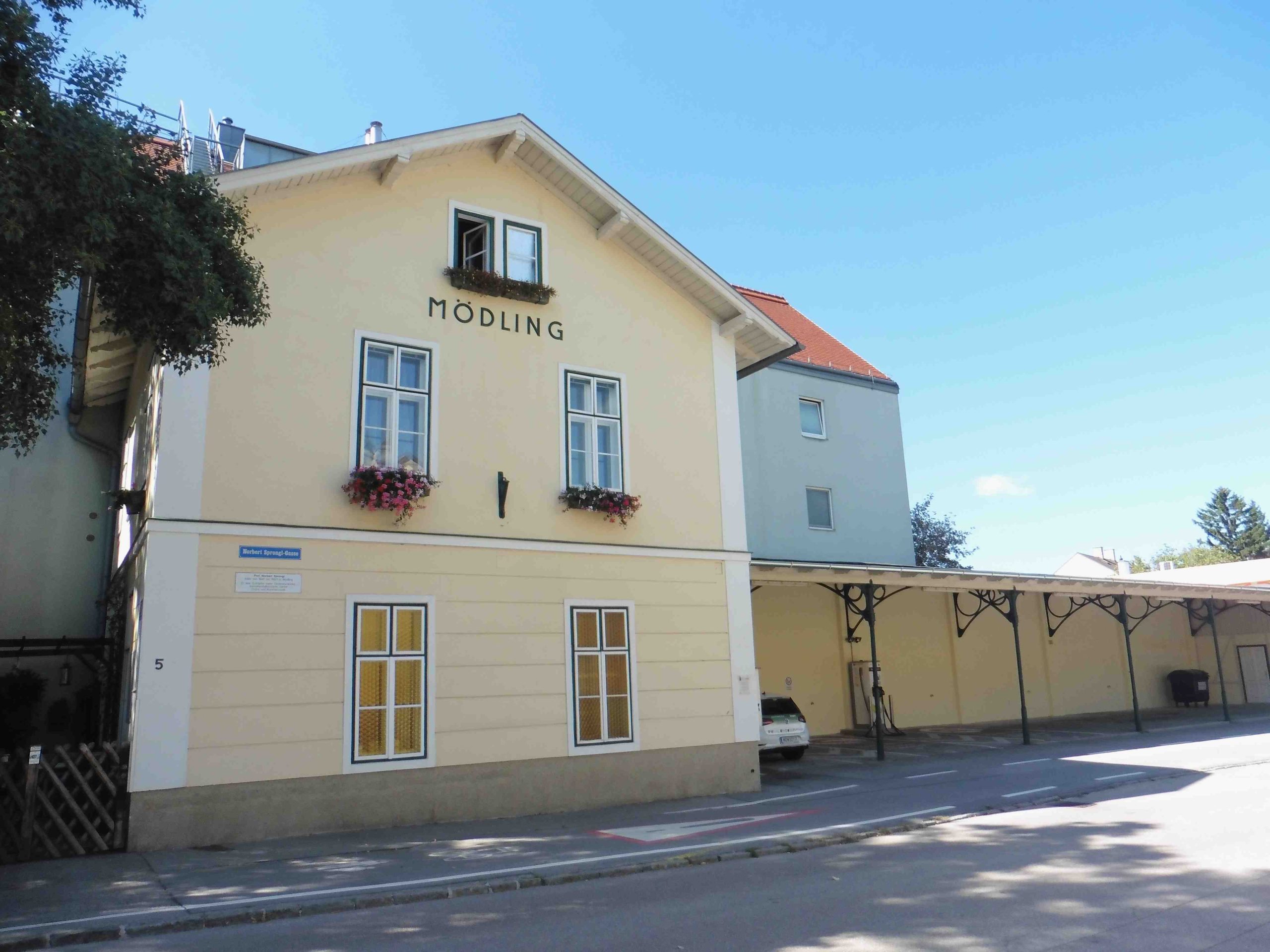 Die Trasse setzt nun in der Liechtensteinstraße und nach dem Schulplatz in der Helferstorferstraße fort. Durch die Josef-Leeb-Straße geht es die Hauptstraße kreuzend kurz in die Grenzgasse, in der in die beschauliche Franz-Gschmeidler-Promenade einzubiegen ist. In der Norbert-Sprongl-Gasse 5 befindet sich schließlich der Bahnhof Mödling – heute ein Privatwohnhaus bzw. eine E-Tankstelle.